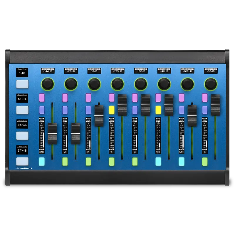 A cutting-edge networked fader bank designed to seamlessly control audio processors, mixers, DSPs, audio software, and a variety of other applications requiring tactile faders, such as lighting control and camera shading. This innovative controller features eight unique SKAARHOJ channel strips, each equipped with a vibrant OLED level meter display, smooth motorized fader, precise encoder, and dedicated 2-way buttons. Additionally, four versatile 4-way buttons enable users to easily toggle through layers or menus and fire snapshots, delivering unmatched flexibility and convenience.